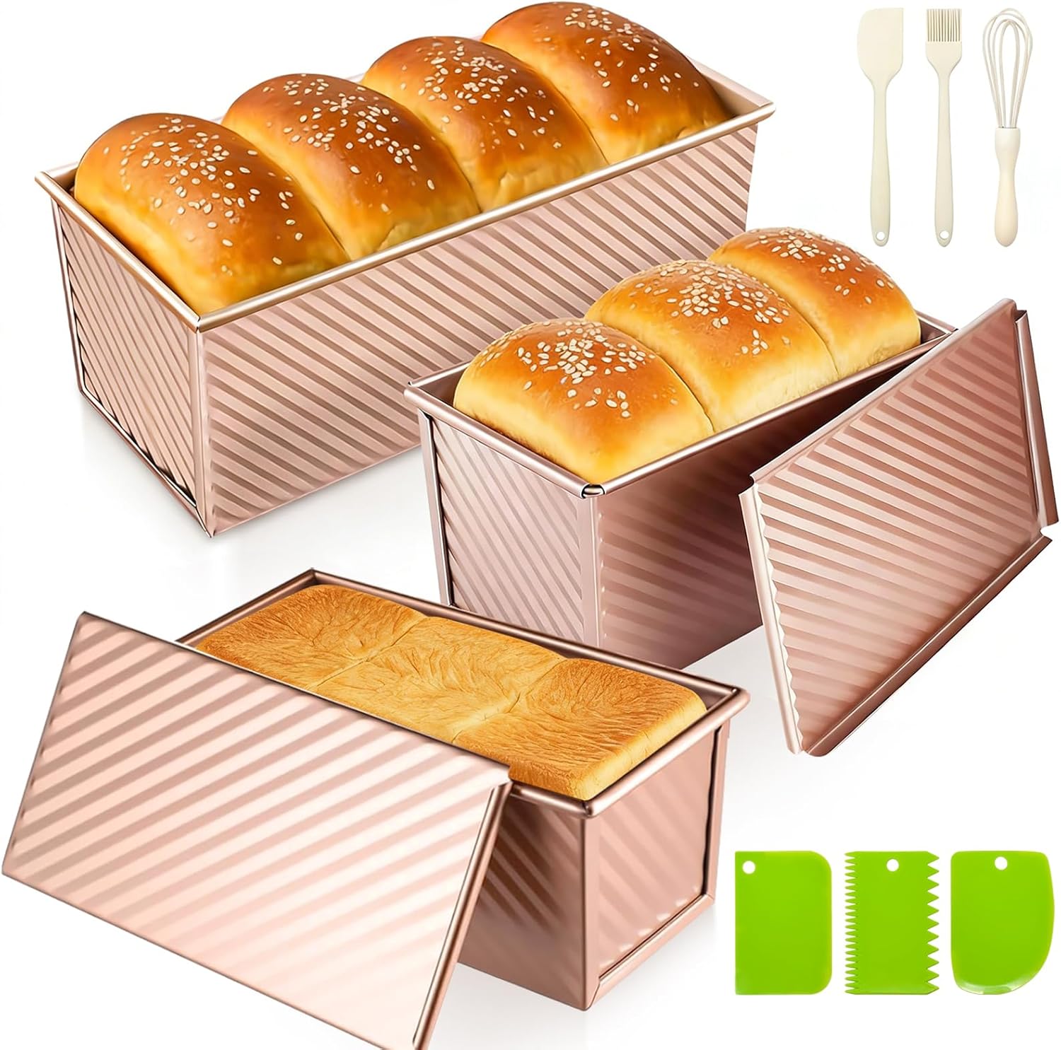 - Versatile Baking for Every Recipe: This bread pan set includes two 1 lb Pullman loaf pans with lids and one 2.2 lb Pullman bread pan, making it ideal for everyday baking and family-sized loaves. Designed for classic toast, sandwich bread loaf pan recipes, and sourdough, these bread loaf pans are perfect for home bakers using a bread machine or traditional oven.